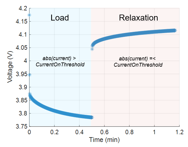 This figure shows the different load and relaxation segments for a given constant current pulse. Typically, the battery ECM parameters are different depending on which segment you use for the parameter estimation process.