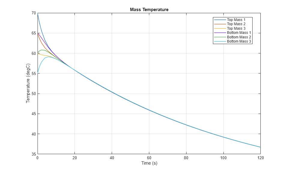 This plot shows the temperature of the cooling plate masses at different locations in the plate over time. Each curve corresponds to a segment of the cooling plate.