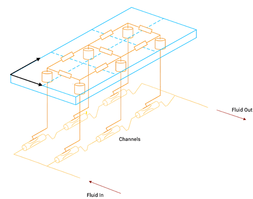 This example shows a discretized cooling plate with cooling channels, divided into six segments: three on the top and three on the bottom. Each cooling plate segment is modeled as a thermal mass, while cooling channels are modeled using the Pipe (TL). The ConductiveHeatTransferArray, a custom component, models thermal conduction between the cooling plate segments.