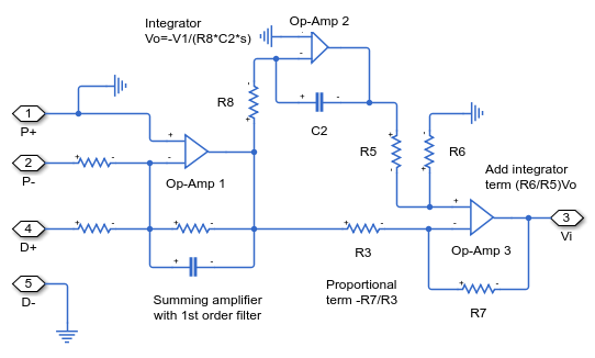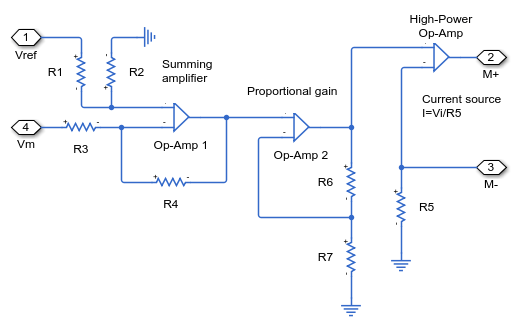 The proportional plus integral controller is implemented using op-amps, the final stage of which is set up as a current source. This then drives a torque motor with resistance and inductance terms modeled. The torque motor directly actuates the spool valve, which in turn controls the main hydraulic circuit supplying the hydraulic ram. Finally, the ram drives a generic mechanical load.