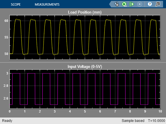 In the model, a hydraulic system implemented in the isothermal liquid domain controls the mechanical load position in response to a voltage reference demand. If the reference demand is zero, then the hydraulic actuator (and load) displacement is zero, and if the reference is +5 volts, then the displacement is 100 mm.