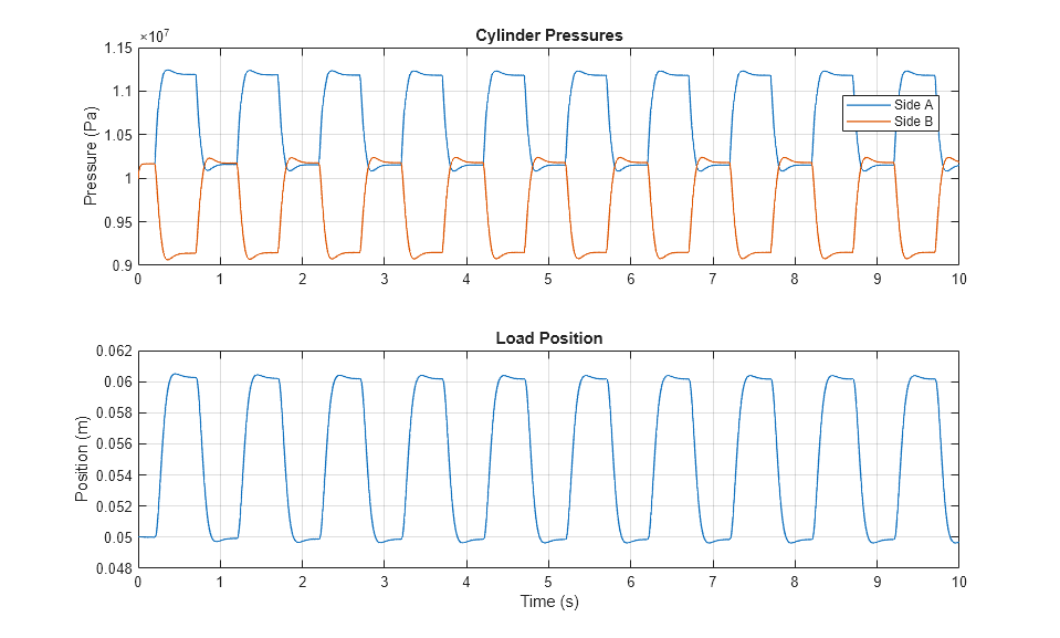 The figure below shows the cylinder pressures and load position plotted in a MATLAB figure. You can also view this data in the Simulation Data Inspector by clicking the View cylinder pressures hyperlink in the model canvas or by clicking the Data Inspector button on the model Simulation tab.