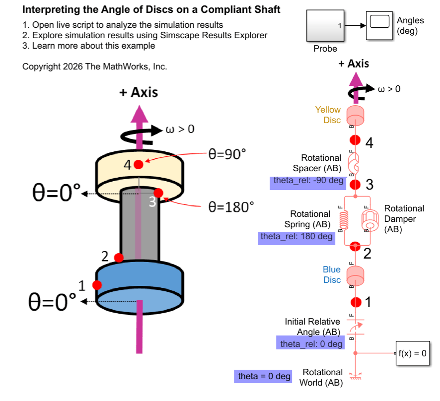 This image shows four different physical views of the two discs on the axis and the corresponding Simscape schematic. Simscape models the two freely spinning discs using a Rotational World (AB) block, two Initial Relative Angle (AB) blocks, and two Inertia (AB) blocks.