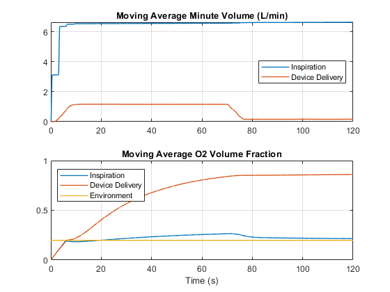 The device has two modes of operation: continuous or pulsating. The simulation starts in continuous mode, which delivers constant oxygen-rich flow to the lung model. At t = 70 s, the simulation switches to pulsating mode, which synchronizes oxygen delivery with inspiration. State Flow™ is used to estimate the breaths per minute and to control the conserving valve in the device.