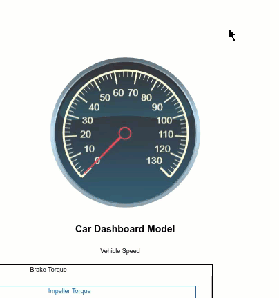 The Circular Gauge block on the right displays the Engine RPM signal on a custom gauge face. To create a gauge like this one, add a Circular Gauge block to your model, and enter design mode. On the Design tab of the Property Inspector, delete the background image and upload car-dashboard-tachometer-gauge-background.png or your own image. When you finish, exit design mode.