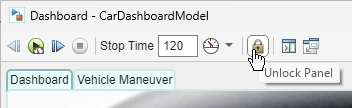The blocks in the panel are display blocks, meaning they display the values of the signals to which they are connected. You can explore the relationship between the dashboard and the model by jumping from any block in the panel to the connected signal. To jump from blocks to their connected signals, the panel must be unlocked. By default, when a panel is open in its own window, the panel is locked. In the toolstrip of the panel window, click the Unlock Panel button.