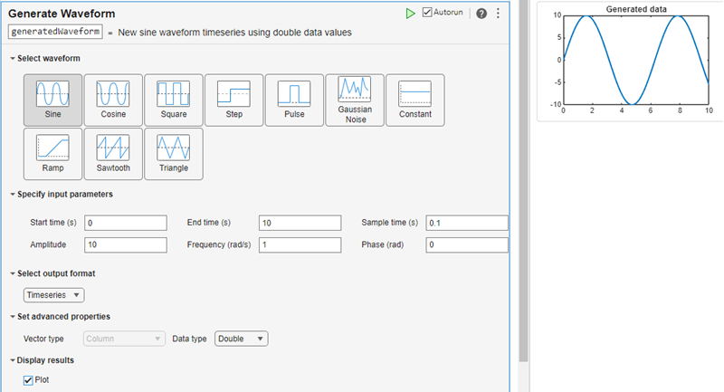 The Generate Waveform task lets you create common waveforms. The task automatically generates MATLAB® code for your live script.