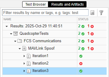 Run the test iterations in the Test Manager. As expected, the first iteration passes since no threat is introduced and the quadcopter operates normally. The second iteration fails because the MAVLink protocol is spoofed by the threat, triggering an emergency landing. By contrast, the custom protocol cannot be spoofed, and the quadcopter continues to operate safely as validated in the third iteration.