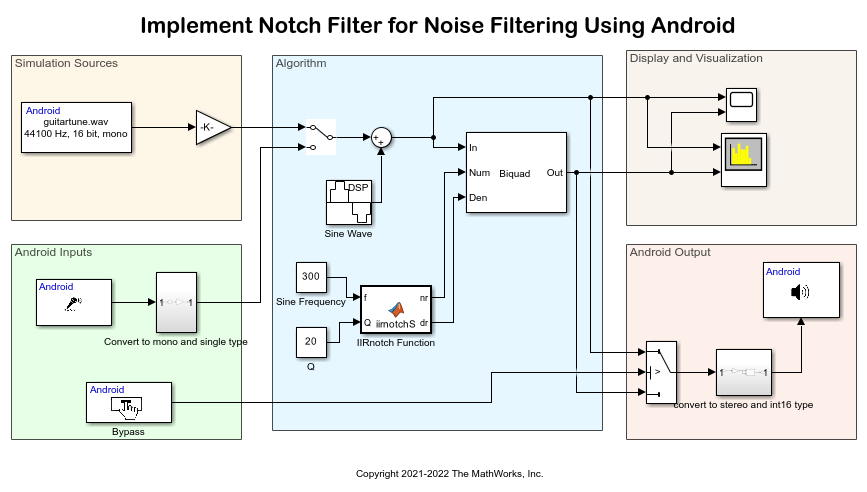 This example shows how to use the Simulink® Support Package for Android® Devices to implement a biquadratic and notch infinite impulsive response (IIR) filter for noise filtering.