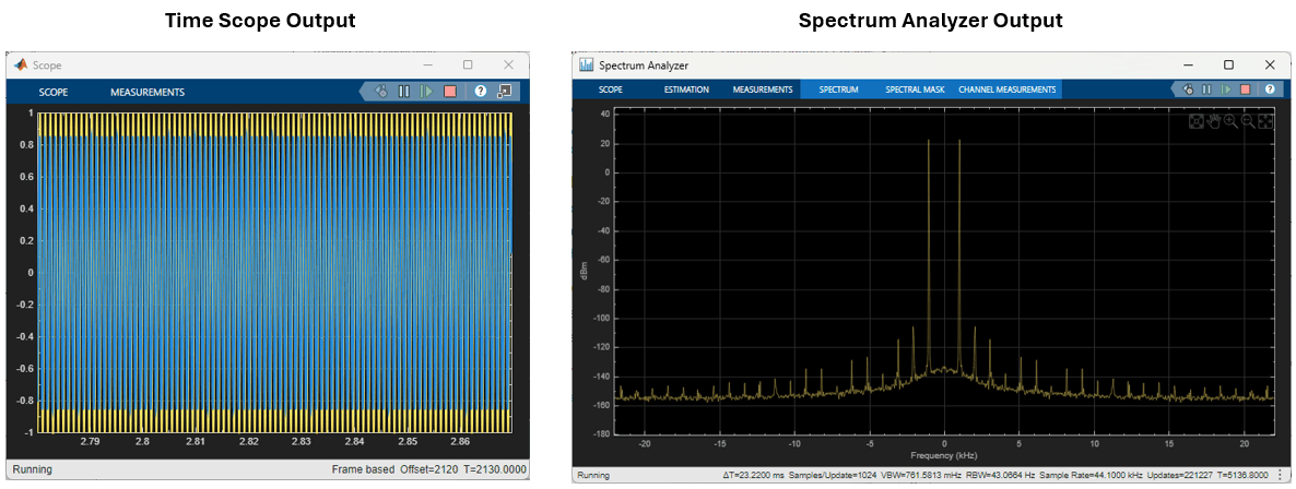 2. On the Simulation tab of the Simulink model, click Run. Observe the Time Scope and Spectrum Analyzer block outputs.