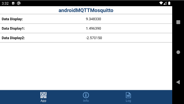 On your Android device, the androidMQTTMosquitto application launches automatically. Observe the X-, Y-, and Z-axes accelerometer data on the application.