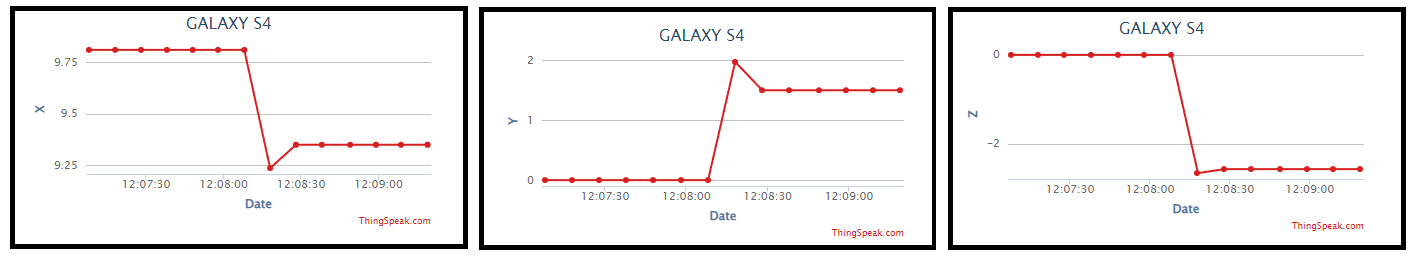 On your Android device, the androidMQTTThingSpeak1 application launches automatically. Observe the Z-axis accelerometer data on field3 of the application.