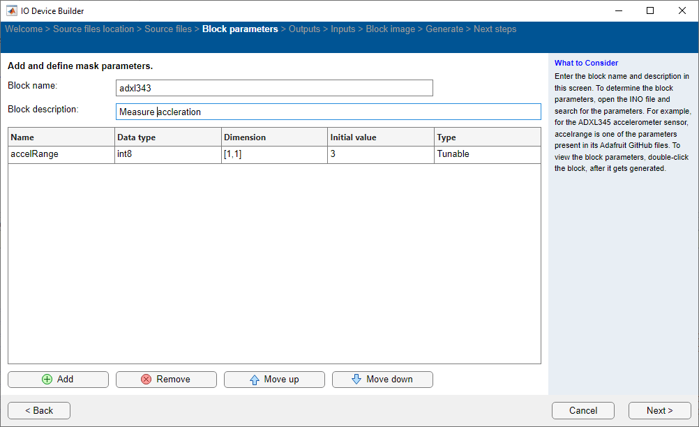 accelRange,int8as Data type,3as initial value, andTunableas Type.Click Next to continue.