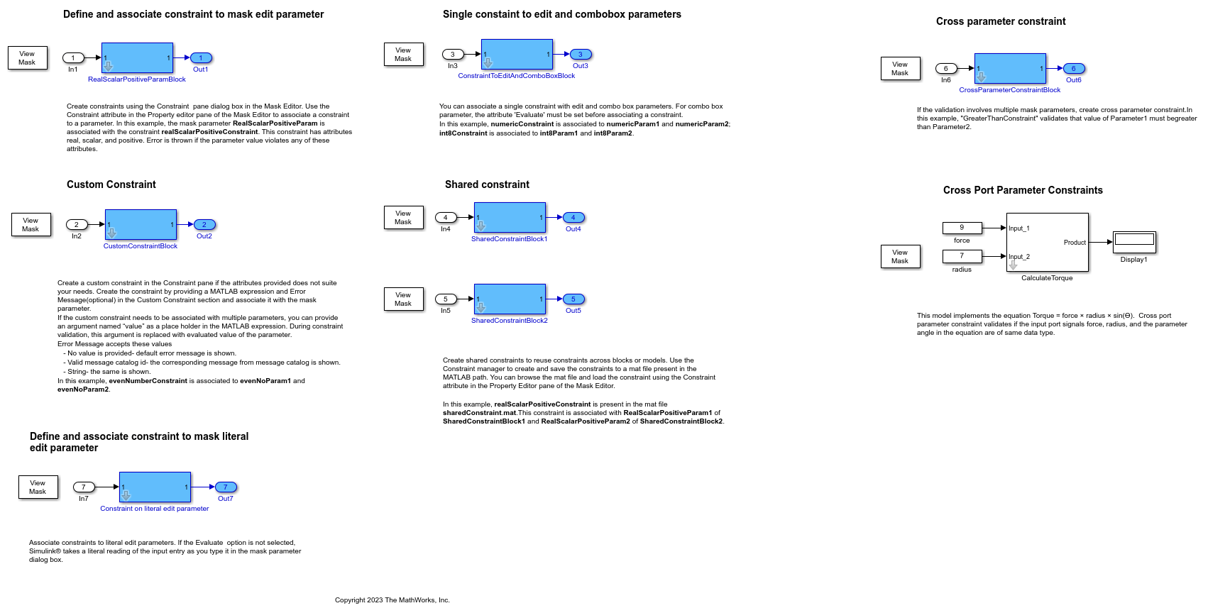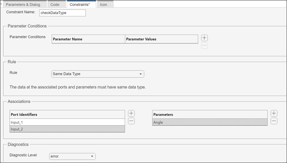 A mask constraint is a set of rules or conditions applied to the parameters, port signals, or both parameters and port signals of a masked block. These constraints are designed to ensure that the parameters and signals adhere to specific requirements, which helps in maintain model consistency and prevent errors. Use cross port parameter constraints to establish constraint among ports and parameters within the same masked block. For example, you can constrain an input port signal, an output port signal, and a mask edit parameter so that they all have the same data type. The available rules for cross port parameter constraint are Same Data Type, Same Dimension, and Same Complexity. Additionally, you can also set parameter conditions to validate the cross port parameter constraints.