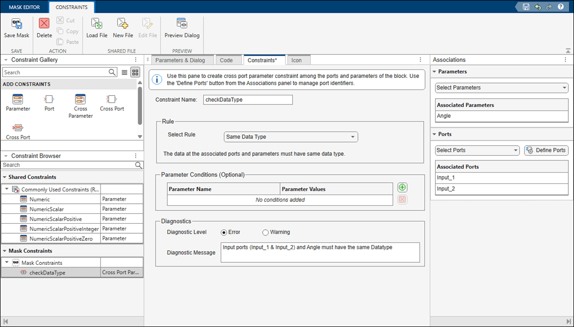 A mask constraint is a set of rules or conditions applied to the parameters, port signals, or both parameters and port signals of a masked block. These constraints are designed to ensure that parameters and signals adhere to specific requirements, which helps to maintain model consistency and prevent errors. Use cross-port parameter constraints to create constraints among ports and parameters within the same masked block. For example, you can constrain an input port signal, an output port signal, and a mask edit parameter so that they all have the same data type. The available rules for cross-port parameter constraint are Same Data Type, Same Dimension, and Same Complexity. Additionally, you can set parameter conditions to validate the cross-port parameter constraints.