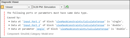 In the model slexMaskConstraints.slx Refer to the block Calculate Torque that implements the equation Torque = force * radius * sin(angle). The model contains two Constant blocks for force and radius with values 9 and 7. Force and radius are the inputs to the input port signals of the masked Subsystem block CalculateTorque. The Subsystem block contains a mask edit parameter Angle to calculate sin(theta) and a cross port parameter constraint checkDataType to validate that the input port signals force and radius, and the mask parameter Angle are of same data type.