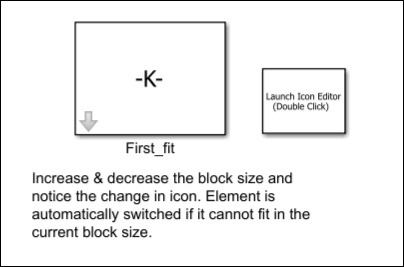 Refer to the block First_fit in the model slexMaskIconEditor. Resize the block and observe the text displayed on the block icon. The biggest size contains the matrix values and the smallest size contains the index K of the matrix.