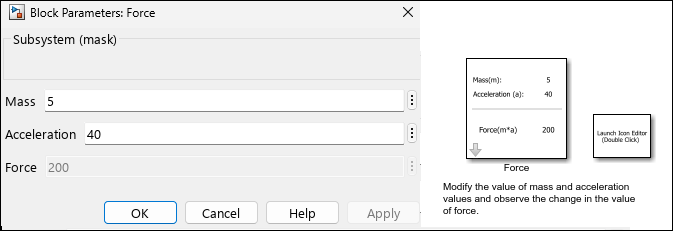 Double-click the block Force, modify the values of mass and acceleration in the mask dialog box and observe the results.