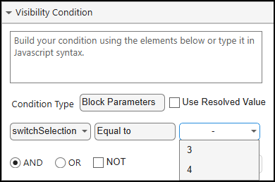 7. To control when a particular part appears as the block icon, enter conditions based on the corresponding block parameters by clicking Set visibility condition in the Element Browser. In the Element Properties pane, click Visibility, and then click Condition Builder. From the Condition Type list, select Block Parameters. Set the parameter to portSelection, the condition to Equal to, and the value to 3 for a three-switch port. Similarly, set the condition for a four-switch port, where the portSelection is equal to 4. Click Apply.