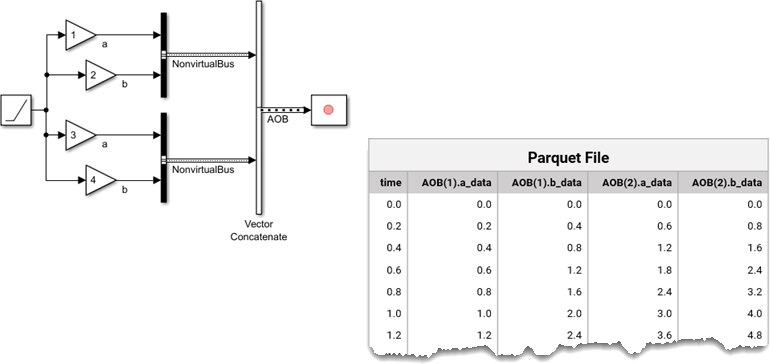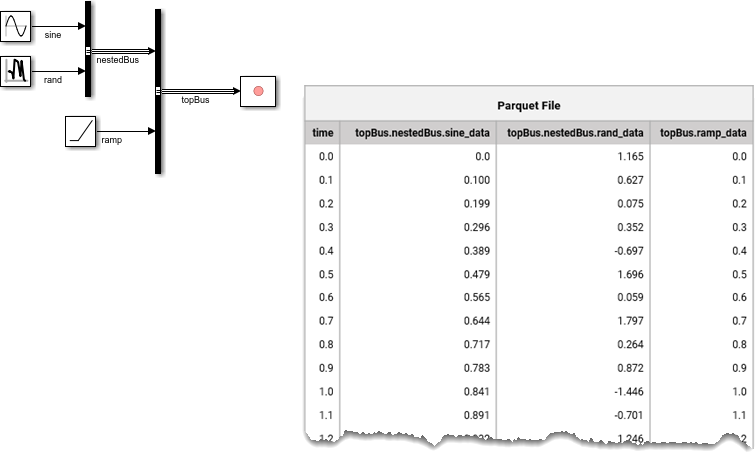 You can export data logged from virtual or nonvirtual buses to a Parquet file. In the Parquet file, dots in signal names specify the bus hierarchy.