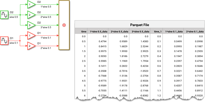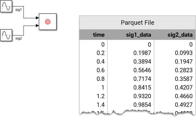 ![A model that logs complex data to a Record block, with the Parquet file storing real and imaginary parts as a two-element vector. For example, at time 0.2, the signal value 0.3973 + 0.5960i is saved as [0.3973, 0.5960].](record-parquet-complex.png)