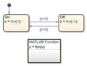 This model contains a Stateflow chart with a MATLAB function that uses the first version of fcn, described previously.