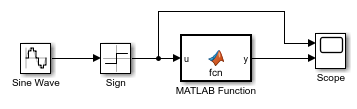 This model contains a MATLAB Function block that uses the first version of fcn, described previously. The MATLAB Function block input is a square wave, which is provided by a Sign and Sine Wave block. The MATLAB Function block adds the value of u to the persistent variable n at each time step.