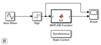 This model contains a MATLAB Function block that uses the first version of fcn, described previously. The MATLAB Function block input is a square wave, which is provided by a Sign and Sine Wave block. The MATLAB Function block adds the value of u to the persistent variable n at each time step. The model contains a State Control block where State control is set to Synchronous.