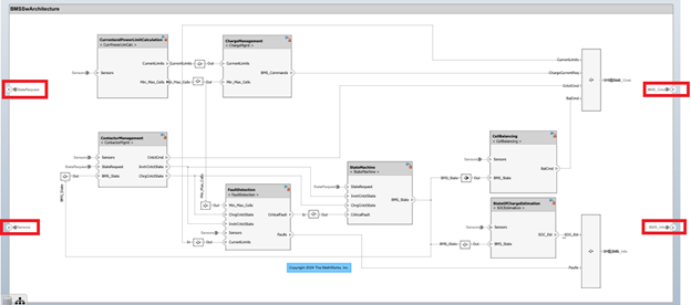 You can manually include the input and output interfaces of the BMS in the architecture diagram at the initial stage. Pause on the component boundary to add the ports and then click the added port to configure it as an input or output port.