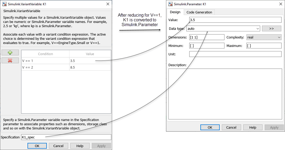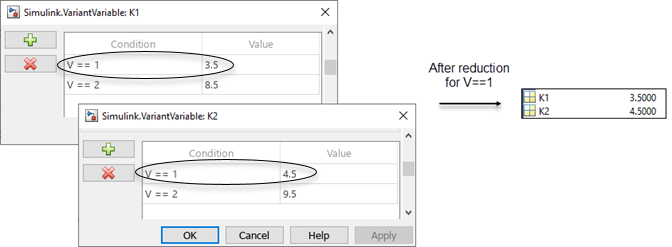 When you reduce a variant parameter object for a single configuration, you specify only a single choice of the object that must be retained in the reduced model. The reduced object will have only one value without any variant capability. So, based on the type of value the variant parameter object has, the reduction process converts it into a normal MATLAB® variable with a numeric value or into a