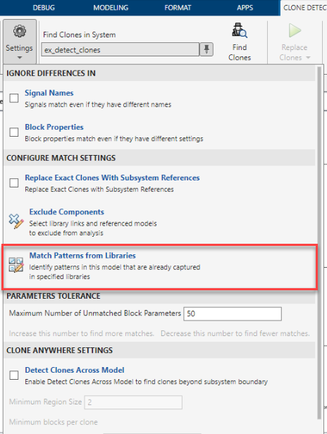 5. In the Clone Detector tab, select Settings > Match Patterns from Libraries.
