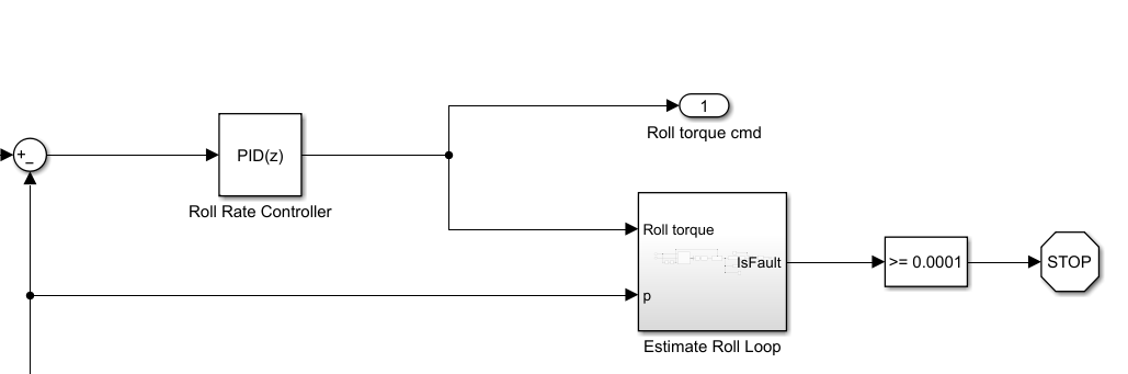 A fault in one of the rotors of the UAV leads to a change in dynamics of the roll and pitch loops. In this example, you use online polynomial model estimation to identify the roll-torque to roll-angular velocity plant model and detect the rotor failure based on change in the estimated parameters.
