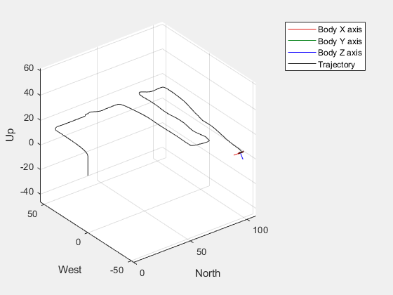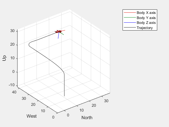 In the model, the visualizations help you observe the UAV during simulation. The first is an animation that shows the attitude of the UAV and the second plots the trajectory that the UAV follows.
