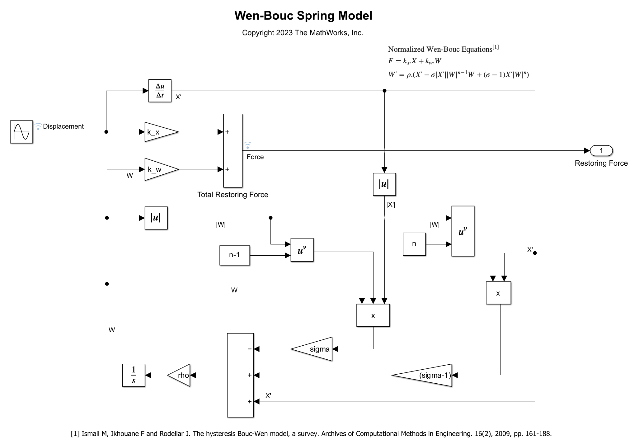 The model consists of a spring that is excited by a sine wave of Amplitude Amp. The spring's hysteresis is modeled using the normalized Wen-Bouc Hysteresis equations