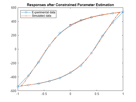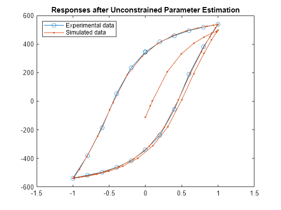 plot(ExperimentalData.Displacement,ExperimentalData.Force,"o-",... Displacement.Values.Data,Force.Values.Data,".-") title("Responses after Unconstrained Parameter Estimation") legend("Experimental data","Simulated data", ... Location="NorthWest")