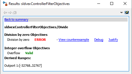 The model is preconfigured with the Ignore objectives based on filter option set to On and a coverage filter file specified by sldvexControllerFilterObjectives_filter.cvf. The coverage filter file consists of a rule that excludes the Abs block from the analysis. For more information on coverage filter file, see Creating and Using Coverage Filters (Simulink Coverage).