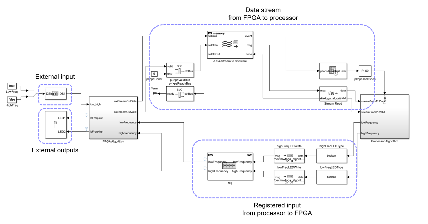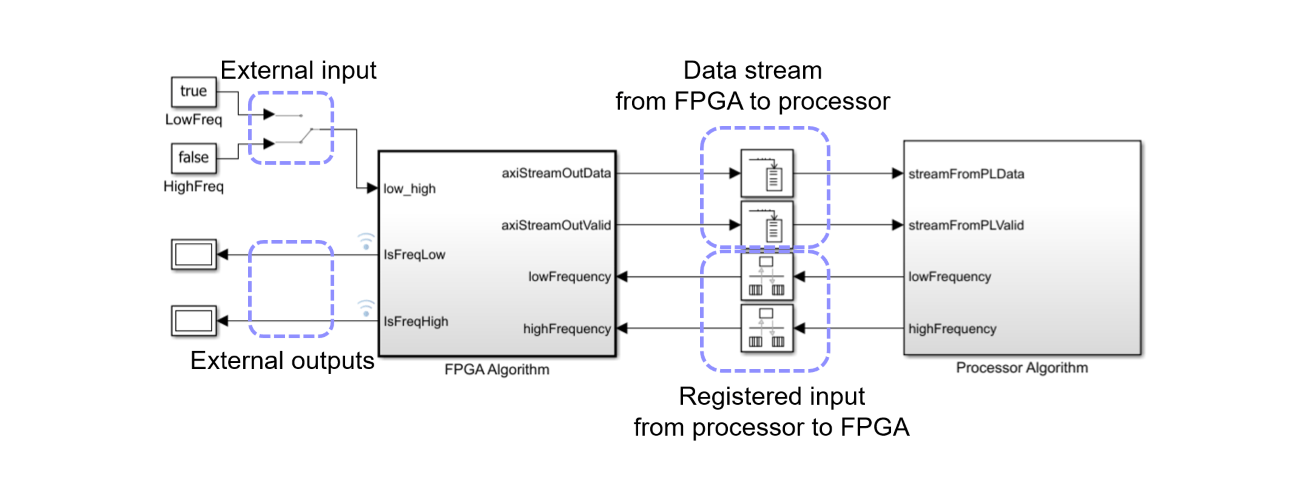 1. Identify the interfaces required for the algorithm. The switch and display blocks serve as external input and external output for the FPGA, respectively. The path from the FPGA to the processor is the data stream. The path from the processor to the FPGA is the registered signal.