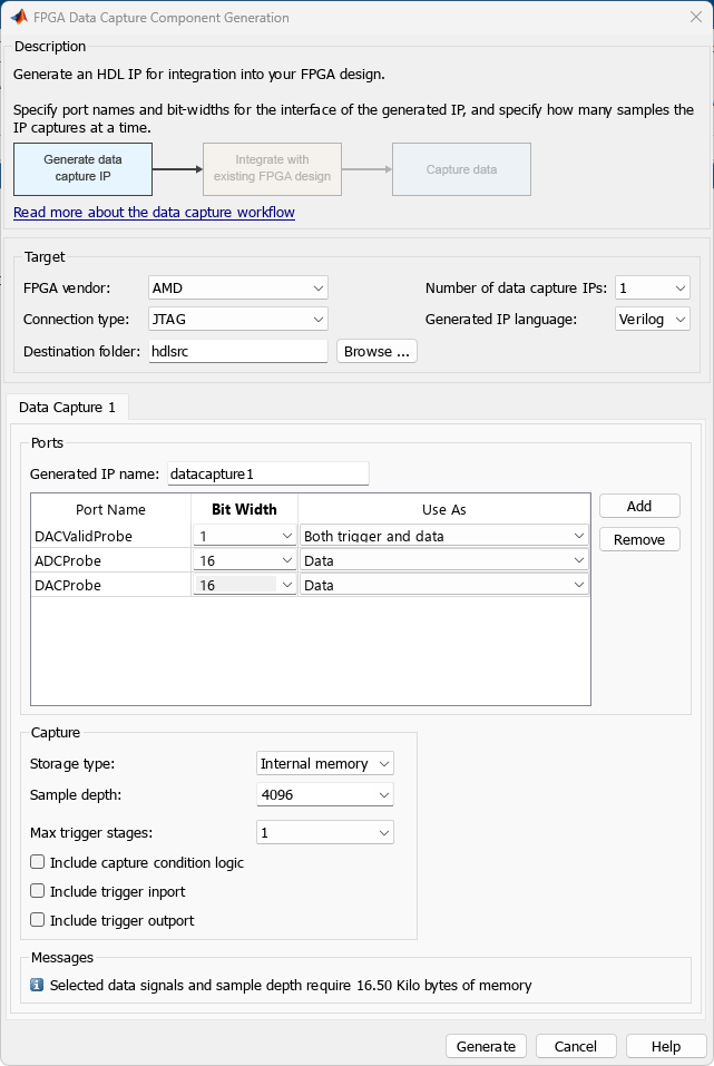 16. Click Generate to generate the FPGA data capture IP in the current working folder. Observe the Messages pane to see total memory used by the data capture IP for capturing the selected signals.