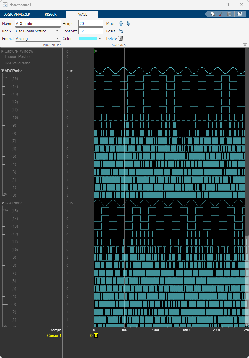3. In the Logic Analyzer app, navigate to the Wave tab, in the Name field, select DACProbe and set the format to Analog. Repeat this step for the ADCProbe signal. You can now view the captured DACProbe, ADCProbe, and dacValidProbe signals in Logic Analyzer.