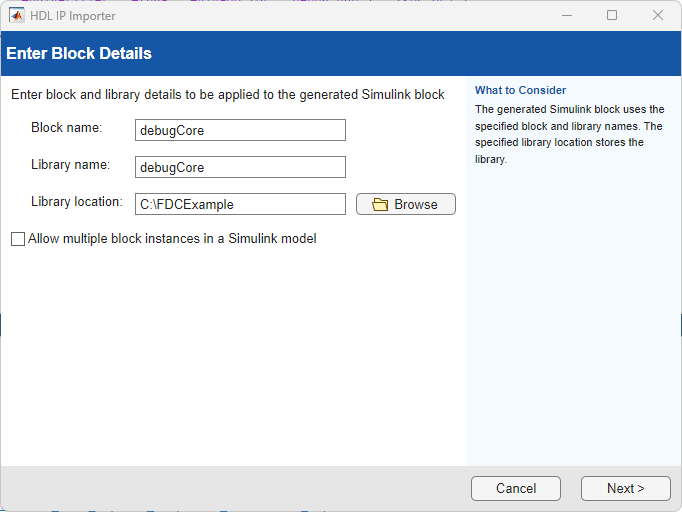 3. Clear the Allow multiple block instances in a Simulink model check box because this example uses only one block instance. Click Next to proceed.