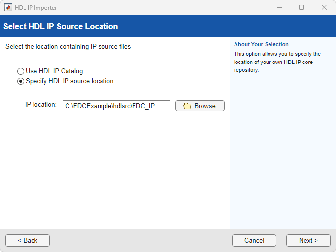 4. In the Select HDL IP Source Location window, select Specify HDL IP source location and specify the IP location for the generated data capture IP.