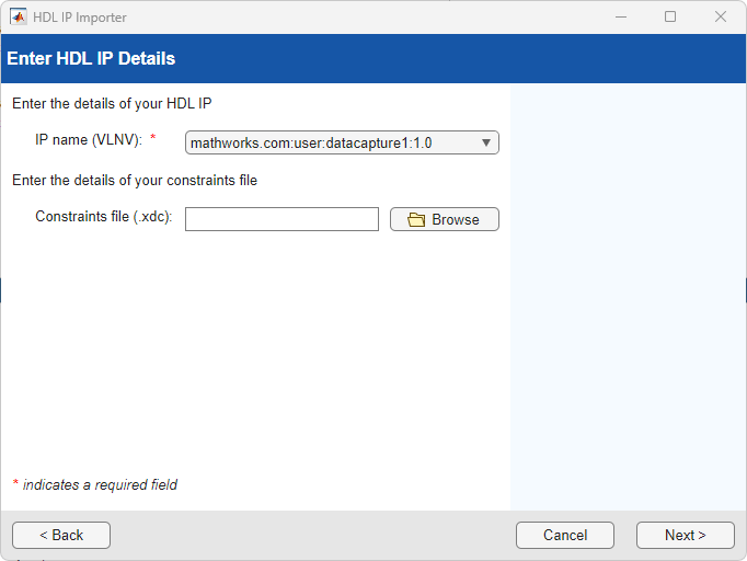 1. Launch the HDL IP Importer by executing the hdlIPImporter command in MATLAB.