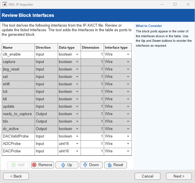 8. The Review Block Interfaces window lists all the interfaces on the block. The required ports for the debugCore block are ADCProbe, DACProbe, DACValidProbe, and clk_enable. Select the interfaces that are not required on the block and click Remove to remove them. Set the data type of the ADCProbe and DACProbe ports to int16.