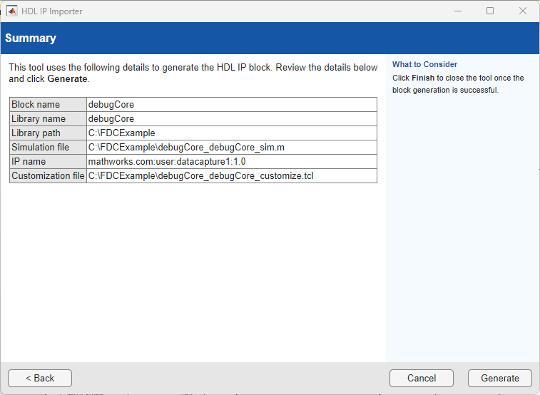 11. In the Summary window, review the details in the table and click Generate to generate the Simulink block.