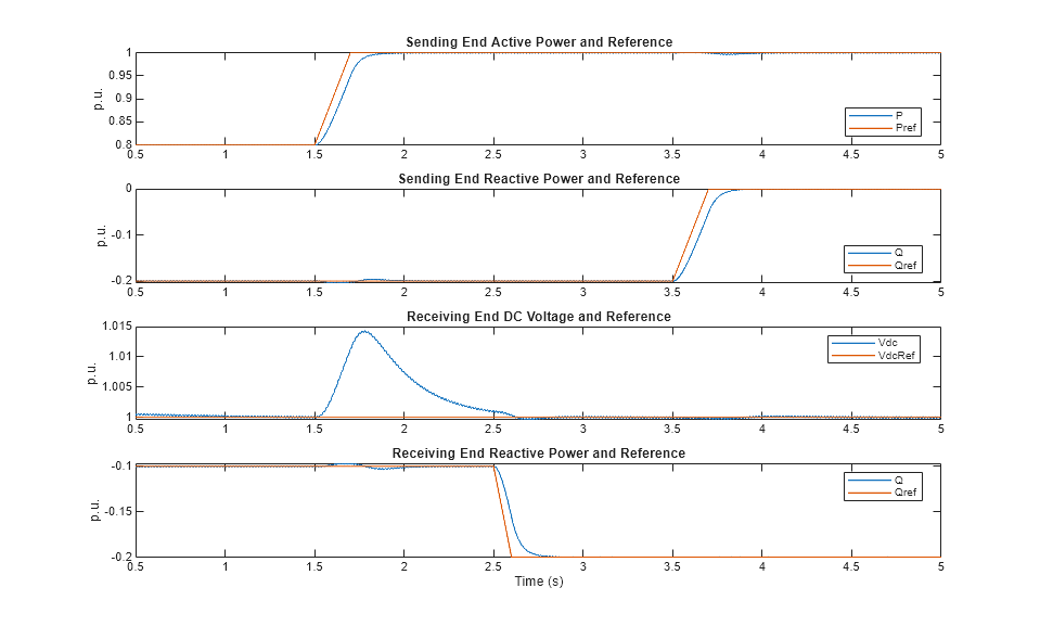 These plots show the active and reactive power of the sending end and the DC voltage and reactive power of the receiving end.