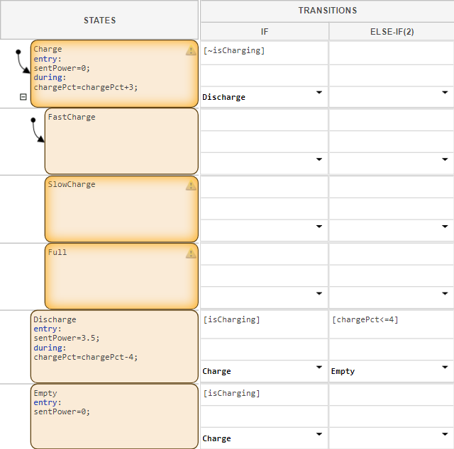 ChargeandFastChargestates both activate. Aschargeincreases, the table transitions to child statesSlowChargeandFull.