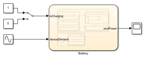 1. Return to the top-level Simulink model. The Manual Switch block changes the operating mode of the main battery. When the value is 1, the battery charges. When the value is 0, the battery discharges.