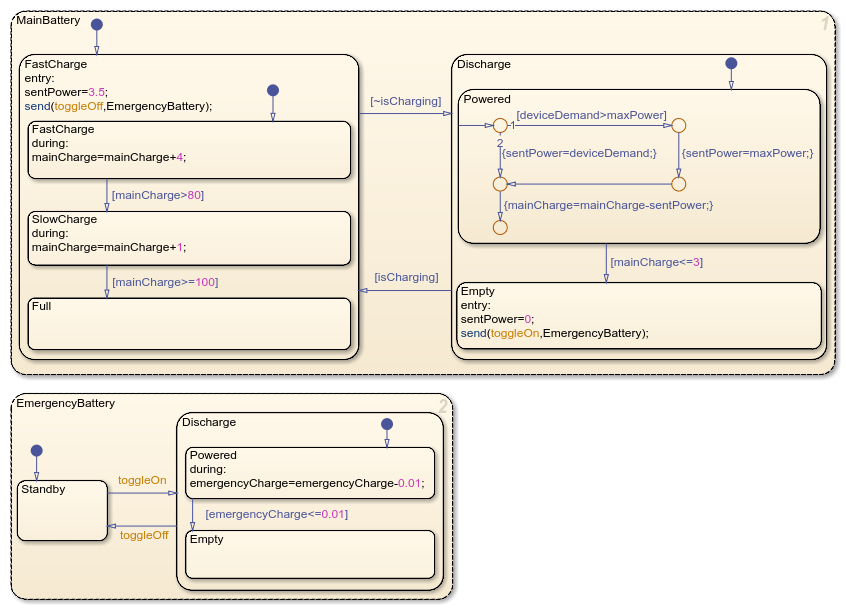 The chart contains two non-parallel states that represent the main and emergency batteries. Each battery contains nested child states that represent operating modes for charging, discharging, or standing by. Additionally, the batteries use input, output, and local data: