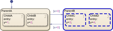 On each time step, the chart executes actions and evaluates transitions for each parallel state in a level of hierarchy in sequential order, which is indicated by the number in the upper-right corner of each state. For instance, when ParentB becomes active, the chart enters both ChildC and ChildD. Because ChildC has an execution order of 1, it sets y to 3. Then, on the same time step, ChildD overwrites y to 4.