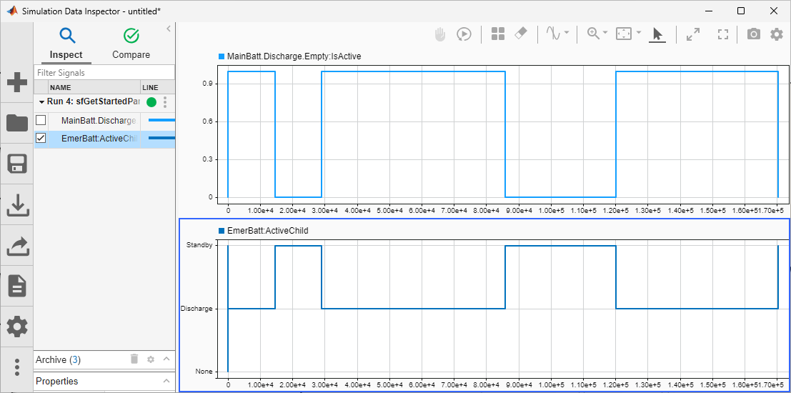 6. To show the activity of the Empty state, in the Inspect tab, click MainBattery.Discharge.Empty:IsActive.